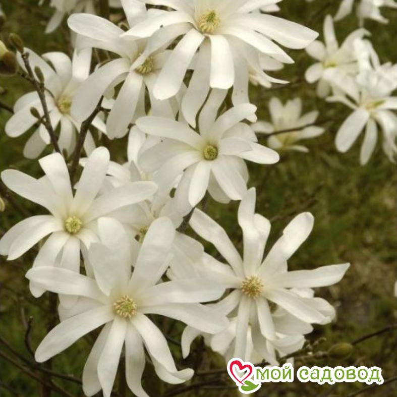 Небольшое дерево до 3 м высотой. За сезон вырастает до 15-16см. Форма — шаровидная. Цвести начинает уже в марте месяце при температуре + 15 градусов и до появления листьев в апреле. Считается самым раннецветущим и морозоустойчивым видом, выдерживает до -30 градусов мороза. Цветки имеют белоснежный или нежно розовый цвет и звездообразную форму.  При подборе места для посадки, стоит учесть, что куст со временем разрастется до 3,5 метров, а часто пересаживать магнолию крайне не рекомендуется. Поэтому заранее отступите от близко расположенных многолетних низко растущих  растений.
